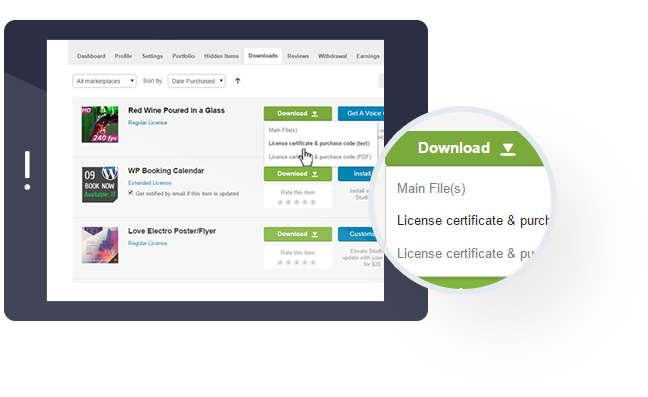 Click “download” button, and in the drop-down menu select “license certificate & purchase code”.